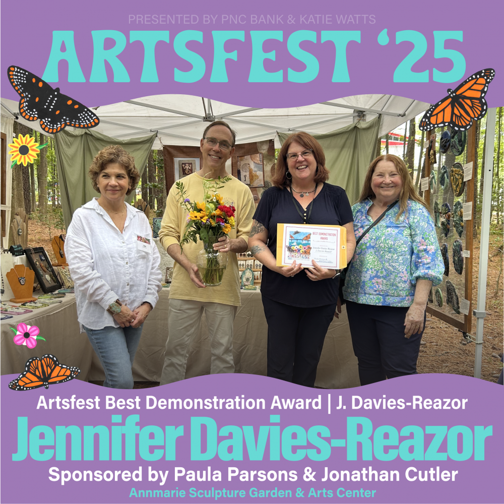 The ArtsWalk/Artsfest 2020 “ Best Demonstration Award" was presented to Eddie Maier, Jr. for his engaging print demos! The award was sponsored by Katie Watts. Pictured are Pamela Teague, Ann’s Circle Board Member; Eddie Maier, Jr.; Jessalyn Walters, Artsfest Coordinator, Annmarie Garden. Congratulations!