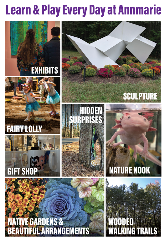 Annmarie Sculpture Garden & Arts Center has something for everyone! Enjoy 30-acres of world-class sculptures, native gardens, Fairy Lolly playground, and Tree-Mendous Trail, or explore the Arts Building, featuring two galleries with rotating exhibits, artful shopping, and our delightfully informative Nature Nook. Hours vary depending on day and season, so click here to plan your visit. We look forward to seeing you!